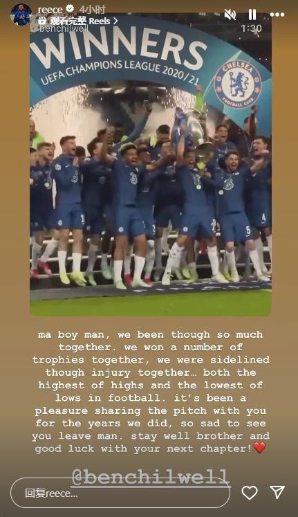 詹姆斯写到:兄弟,我们一起经历了太多。我们一起赢得了许多奖杯,也一起因伤缺阵……一起经历了足球生涯中的巅峰和低谷。这些年来,能和你一起并肩作战是我的荣幸,很遗憾看到你离开。兄弟保重,祝你接下来的篇章好运!